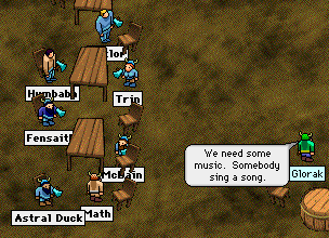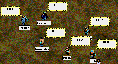 Town Crier yells: It's 3 o'clock, and all's well. McBain: are there any DM healers? Humbaba: Arcail. Math: Warplet, Tarf, Arcail? Fensaith: Warp Math: Three of the greatest healers. McBain: active healers- I thought Warplet's on vacation Humbaba ponders: just most of the leadership... Math: Uh-huh. Humbaba: If Warp doesn't get out of that library soon, he's going to be a sucky healer... heh. Math: Trin's supposed to show up... McBain ponders: wish I could get this many shares on any night Humbaba: We should move the meeting to somewhere more remote, but within BEER yelling range of town square. Fensaith: The bar! Humbaba: maybe just NW of here. Humbaba: Can we hear yells in the bar? Math: No. Fensaith: D'oh. You begin sharing your experiences with Trin. You are sharing experiences with Trin, Fensaith, Petlor, Humbaba, and McBain. Trin: <: Humbaba yells: BEER! Math: Hi Trin! Math yells: BEER! Petlor yells: BEER! McBain yells: BEER! Trin yells: BEER! Fensaith yells: BEER! Math: Nice. ;) Trin is sharing experiences with you. Humbaba: Good pic. Fensaith: Heh Math: Humbaba, I have another pic for you, too. Petlor: Chorus of Drunks! Humbaba: cool. Math: Let's all go to the inn...if anyone else connects, we can run out and yell for them. Humbaba ponders: ooc: i need to upload home picts to work... sigh. Glorak belches. Bartender: Scram, Math. My ales cost 200 coins -- which is more'n yez can afford, ya piker. Glorak hiccups. Math ponders: I represent your main patron. Glorak sways back and forth. Humbaba: Hiya, Glorak! \Action: Trin offers her friends a home-brew. Math: Yes, Glorak's here too. ;) \Action: Trin drains her beer in one gulp. \Action: Fensaith sits. Glorak hiccups. Glorak hiccups. Glorak: Ah, Trin. Somebody could get hurt. Glorak sways back and forth. \Action: Math grins. Glorak: 'scuse me, there, McBain. Somebody could get hurt. Humbaba: How are we doing on collecting money? Trin: Ah... sharp hat Glorak: 'scuse me, there, McBain, I don't mean any trouble. Glorak: 'scuse me, there, McBain, my pal, how about a drink? Trin: 182 Glorak: 'scuse me, there, McBain, I don't mean any trouble. Math: Yeah...how are people money-wise? Fensaith: 202 Humbaba: 18 Glorak: Hey, watch where you're walking, McBain. Somebody could get hurt. McBain: yikes- 13 Petlor: 0 You have 32 coins. Glorak: 'scuse me, there, McBain, my pal, how about a drink? Fensaith: heh Trin: hrmmmm Math: 32...including donations. :/ Glorak: What happened to my ale? Humbaba hands you 14 coins. Trin: The math don't work Fensaith: Not a good sign.... Trin: <: Glorak: Let's play a game. Who has some dice? Math: Heh. ;) Petlor: Wait. I lied. 2 coins. You gave good karma to Humbaba. Humbaba: I have 4 now. Glorak sings 'Oh, let's have a tankard of beer, my dear...' McBain: I've been tipping healers- doesn't hurt to make friends Trin: ooh sorry, 18.2 coins<: Petlor: Who do we give the $$$ to? Humbaba: I give 1 coin to each healer when I have fallen. Glorak hiccups. Humbaba: Give to Math. McBain hands you 10 coins. Trin: Yes, Been tithinf myself Glorak hiccups. Trin: tithing... \Action: Trin sips her beer. Fensaith: Is the bank accessible? Petlor hands you 2 coins. Math: Give to me for now... when Warplet returns, give to him. Trin ponders: Trin continues to slur her speach \Action: Humbaba cracks out a sixer of Puddleby Porters for everyone. Shannon: ! Glorak sways back and forth. Trin: Yes, for 5% Fensaith: Ugh. Trin: But, it is lust a mirror McBain: Where's good hunting for large vermine? McBain: good money to be made Trin: Don't seem safe to use da bank yet Shannon: north feild Math: Bank's not reliable... it's there for now but will be gone later. Fensaith: North forest, if we have three times as many people Glorak: Damn the Emperor! Trin: Yes- Lg vermin Glorak sings 'Oh, let's have a tankard of beer, my dear...' Trin: wurms Trin: slugs Glorak belches. Humbaba: Slugs is good. Humbaba: I can hit 'em now. Trin: and ferall explosions Fensaith: Snake hunting is the best way to make money Trin: if ya good amny Trin: many Glorak sways back and forth. \Action: Fensaith grins Trin ponders: Trin continues to slur her speach McBain: snakes hurt Fensaith: Bu tthey die easy Humbaba: I can't hit snooks. Math: So far I've gotten: 20 from McBain, 9 from Bobwa, 14 from Humbaba, 2 from Petlor. Thanks all. Glorak hiccups. Trin: Give 82 to Math Humbaba: heh Fensaith hands you 100 coins. Shannon: any one wanta 200$ beer? Humbaba: Cut Trin off... Trin hands you 82 coins. Humbaba: I do!! Shannon: eheh Trin: There! Trin: Geez Math: Thanks Fensaith and Trin. \Action: Fensaith smiles. McBain: is it still 2000 to re-start the clan? Humbaba: We're 15% of the way to 2000. Math: Hi Shannon... This is a Dwarven Militia meeting. Math: 2400, to be precise. Trin: and 100 x four Humbaba: true. \Action: Math nods. You have 240 coins. Glorak sings 'Oh, let's have a tankard of beer, my dear...' McBain: someone remind me- I have more verses to Glorak's song... Trin ponders: got me hundred <: Math: I have 240 now. 10% exactly. =) Bartender: Bartending is a dangerous job, look what the pirates did to me bar! Glorak sways back and forth. Petlor: heh Trin: Yea! 10% Bartender: Scram, Shannon. My ales cost 200 coins -- which is more'n yez can afford, ya piker. Humbaba: Wooo! Trin: I week to go and it will all be in! Math: Cool, McBain. Fensaith: I have my hundred. \Action: Fensaith grins Bartender: Shannon, get out o' my sight. What with pirates stealing all but me emergency stash, I'z gotta charge 9080 coins fer these kegs. Glorak sways back and forth. Humbaba: Two weeks, 10%, that's 20 weeks total, 18 weeks away! Bartender: Scram, Shannon. My ales cost 200 coins -- which is more'n yez can afford, ya piker. Glorak belches. Trin: hrmmm \Action: Humbaba is smart Glorak sways back and forth. Shannon: 9080 is the price for a keg Humbaba: heh Trin: Home_Brew Glorak hiccups. Math: Heh. People will get more money as they get more powerful. Say, next week we raise at least 600, t