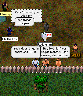 After some brave souls trapped the stupid giant behind a fence, Hybrid took it upon himself to taunt it until it followed him out the gate and back into the city.  His name has been cursed a hundred times and will surely be cursed a hundred more, but he is uncaring whether he is accepted on our island or not.  He revels only in causing mayhem and destruction.  How sad that we must tolerate such behavior among us.