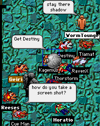 Shadow Sky, who cannot be seen in this picture because he is off the top of the screen moved only slightly forward after this so I could see his feet, the grey wound up his arm in an attempt to hit him we all watched helplessly as the rock sailed through the air hoping and praying that Shadow Sky would see the impending doom coming towards it before it was too late. Unfortunalty he was not, I was the only one able to see the death of Shadow Sky at this time so I relayed the news of his demise to the rest of my incapacitated friends below me. Hope was not lost. Grubs came in and took a swing at it. This was enough to lead the Grey out of the corridor in the healers temple and into the larger room and from there outside to its demise.
