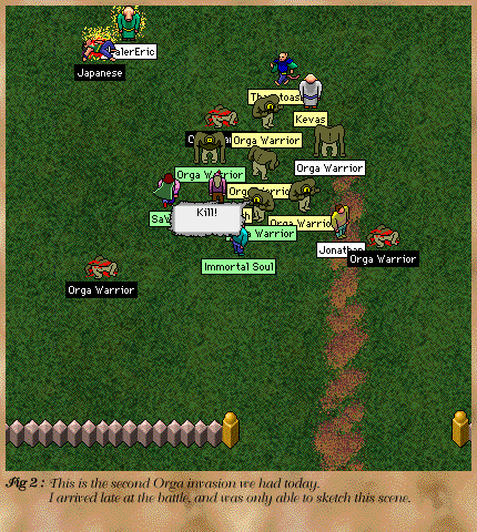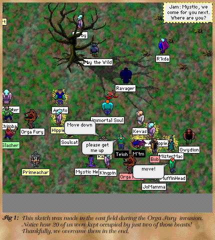Earlier today, a horde of Orga Furys made their way towards Puddleby. Our only warning of their approach was the combined sound of their heavy footsteps, which, from a distance, were mistaken for the sound of drums. Several people went east to investigate the sound, only to return screaming that Orgas were coming. With a band comprised 40-strong of mostly fighters, we were able to only just turn back the Orga threat in the east field. Being a relatively weak fighter, I can take little credit for the victory that we earned. Many of us were killed, more than once, by the horde. The battle continued for at least an hour before the sound of "drums" stopped and we were informed that the imminent Orga attack had just be averted. Enclosed is a sketch of this battle (Fig. 1). From the direction of their approach, we can only assume they came from the Orga encampment.